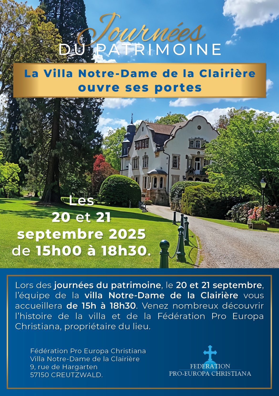 La Villa Notre-Dame de la Clairière, ancienne demeure des directeurs des mines de Creutzwald construite en 1906, abrite aujourd’hui le siège social de la Fédération Pro Europa Christiana. Celle-ci y a été inaugurée solennellement le 7 mai 2006.