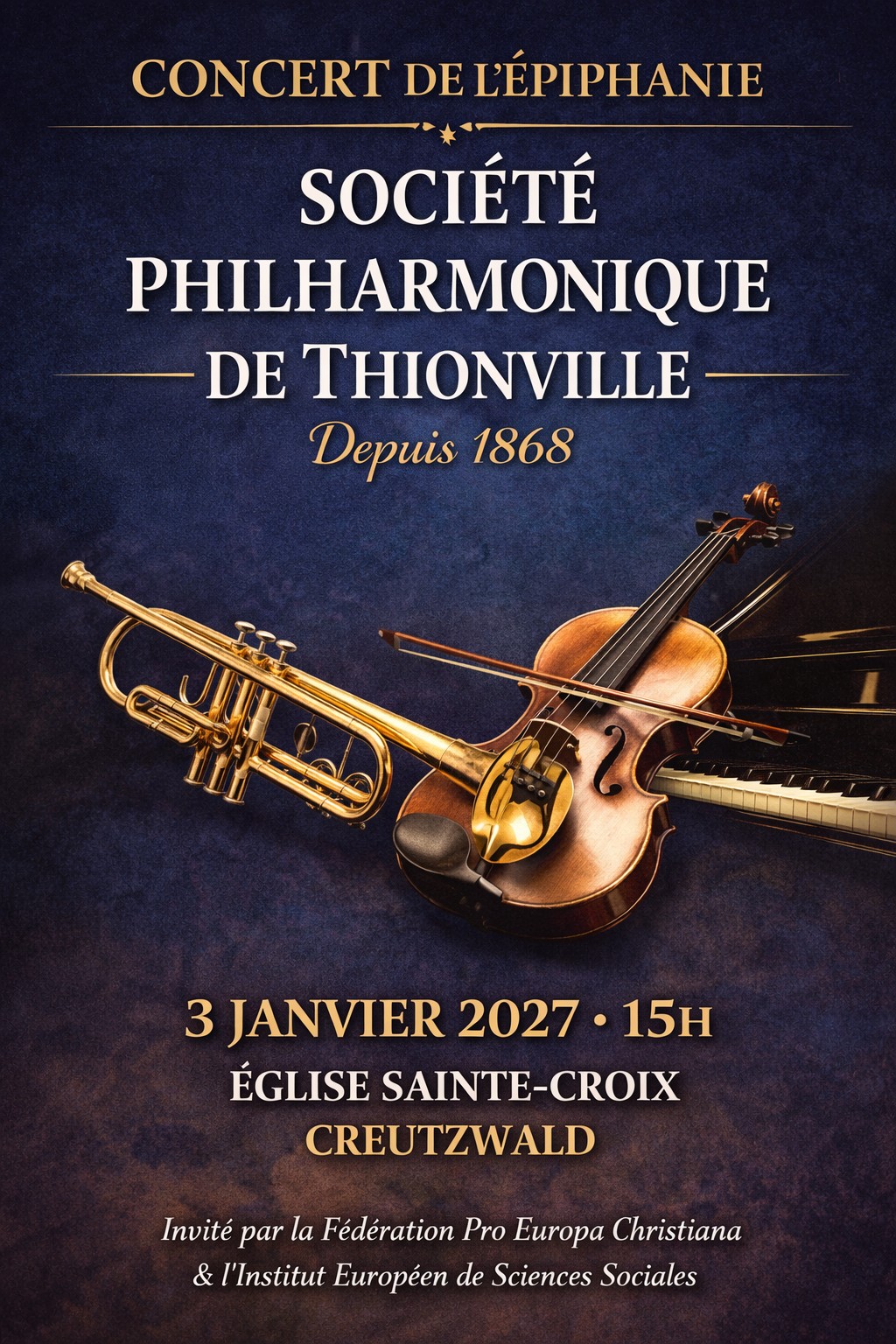 Dans ce cadre, la Société Philharmonique de Thionville a été invitée par la Fédération Pro Europa Christiana et l’Institut Européen de Sciences Sociales pour donner le concert de l’Épiphanie, le 3 janvier 2027 à 15 heures, à l’église Sainte-Croix de Creutzwald. Ce concert réunira également la soprano Laureen Stoulig et le pianiste Marlo Thinnes.
